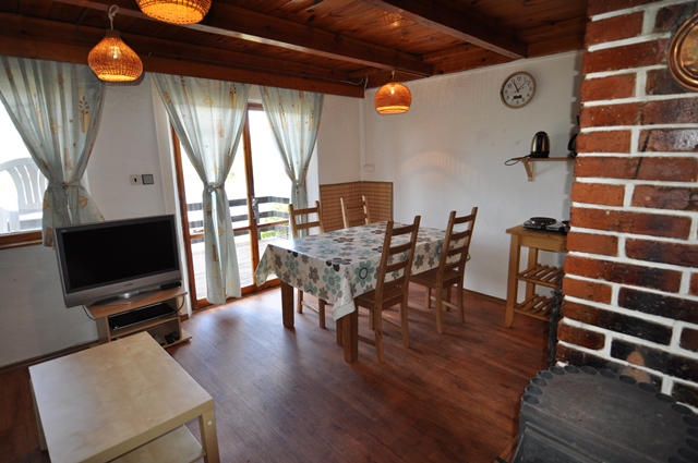 Im Keller des Hauses gibt es einen Keller, in dem es einen Grill gibt, und die Gäste können ihre Fahrräder hier aufbewahren. Im Erdgeschoss gibt es ein kleines Badezimmer mit Dusche und Waschbecken. Dann separate Toilette. Geräumiges Wohnzimmer mit einer Küchenzeile, wo es ein Sofa, Kamin, Esstisch, Stühle gibt. Vom Wohnzimmer gibt es eine Terrasse mit Blick auf den See. Auf der Terrasse gibt es Gartenmöbel aus Kunststoff. Die Küchenzeile (Nutzwasser) ist mit einem Kühlschrank, Geschirr, Esstisch, 4 Stühlen, einem Elektroherd mit zwei Kochplatten, einer Mikrowelle und einem Wasserkocher ausgestattet.