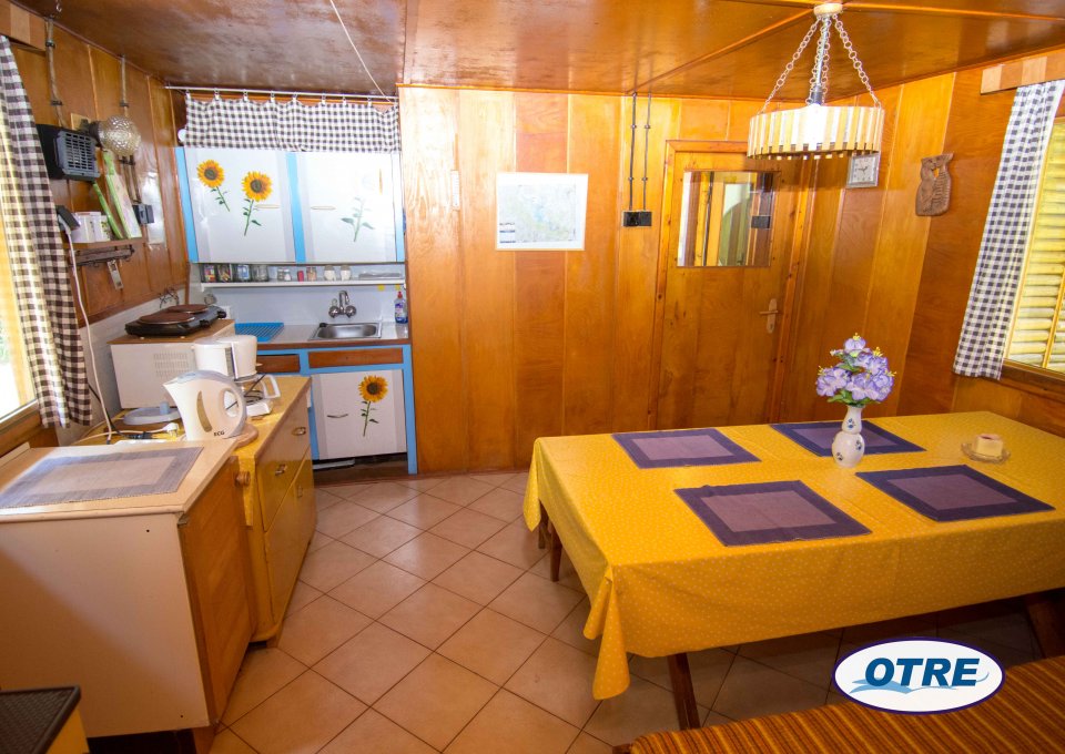 V přízemí chaty je vstupní chodba, kde je umístěná lednice. Dále kuchyně s el.vařičem (2 plotýnky), kávovarem, varnou konvicí, mikrovlnnou troubou, T+S užitkovou vodou, jídelním stolem s lavicí a kamny. Je zde také obývací pokoj s TV a posezením. Najdete zde také odpočinkový prostor pro 1 osobu (přistýlka) a jednoduše zařízenou koupelnu s WC a sprchovým koutem. Do patra chaty vedou velice strmé schody (žebřík) a proto pobyt zde nedoporučujeme s malými dětmi. V podkroví chaty jsou připravené dvě dvoulůžkové ložnice.